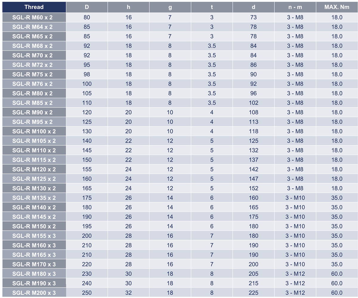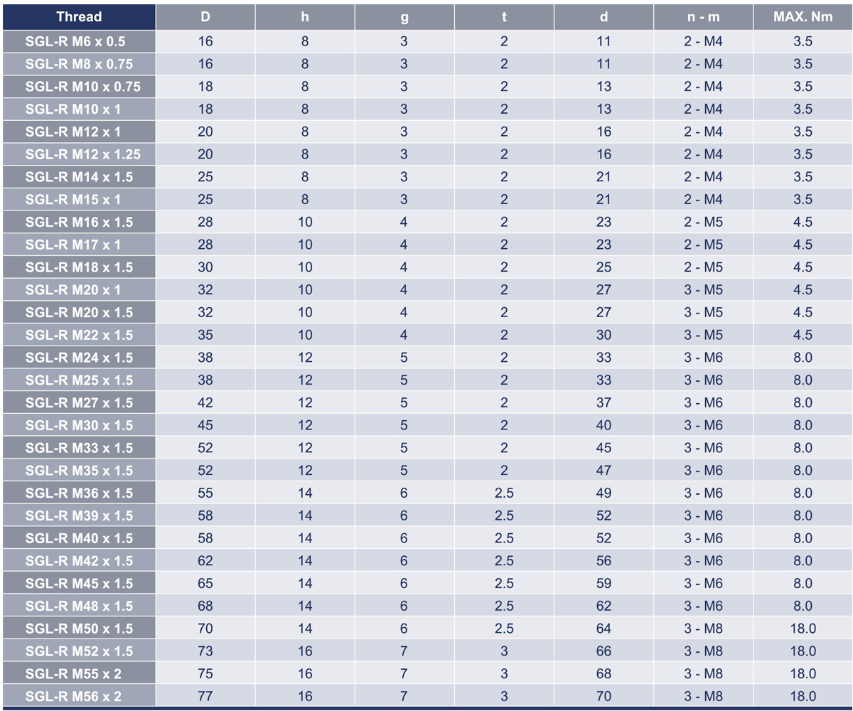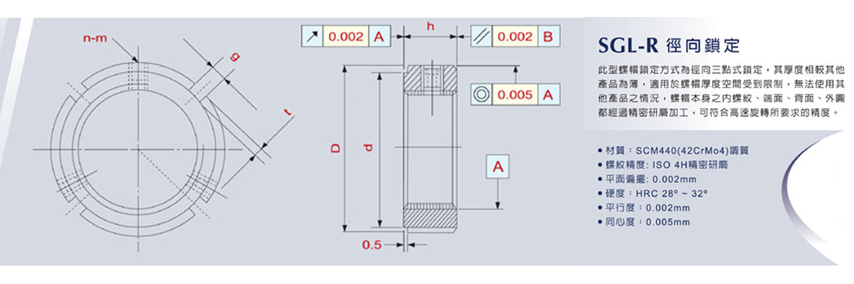 此型螺帽鎖定方式為徑向三點式鎖定,其厚度相較其他產(chǎn)品為薄,適用于螺帽厚度空間受到限制,無法使用其他產(chǎn)品之情況,螺帽本身之內(nèi)螺紋、端面、背面、外圓都經(jīng)過精密研磨加工,可符合高速旋轉(zhuǎn)所要求的精度。