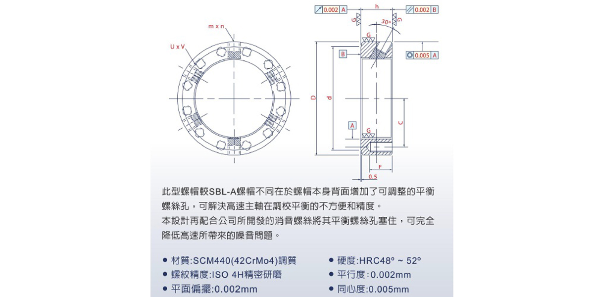 此型螺帽較 SBL-A螺帽不同在于螺帽本身背面增加了可調整的平衡螺絲孔,可解決高速主軸在調校平衡的不方便和精度。本設計再配合公司所開發的消音螺絲將其平衡螺絲孔塞住,可完全降低高速所帶來的噪音問題。和風切的噪音問題。
