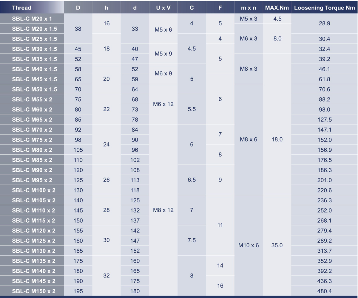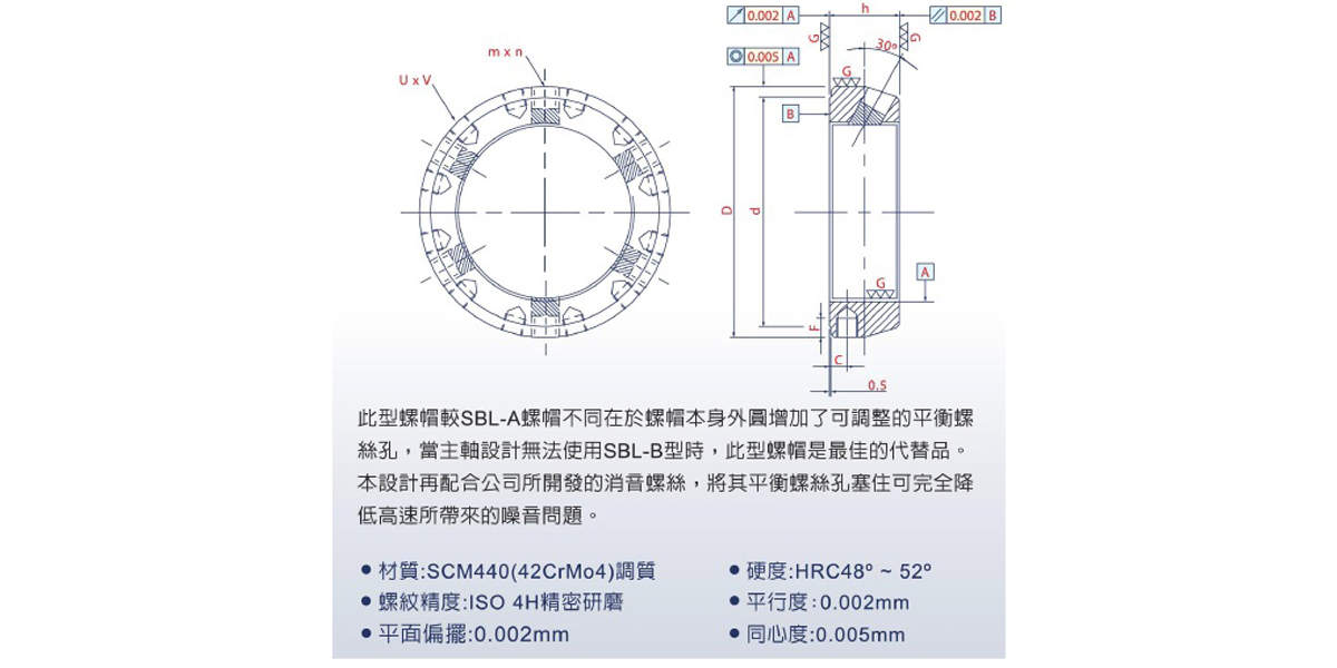 此型螺帽較 SBL-A螺帽不同在于螺帽本身外圓增加了可調整的平衡螺絲孔,當主軸設計無法使用 SBL-B型時,此型螺帽是最佳的代替品。本設計再配合公司所開發的消音螺絲將其平衡螺絲孔塞住,可完全降低高速所帶來的噪音問題。