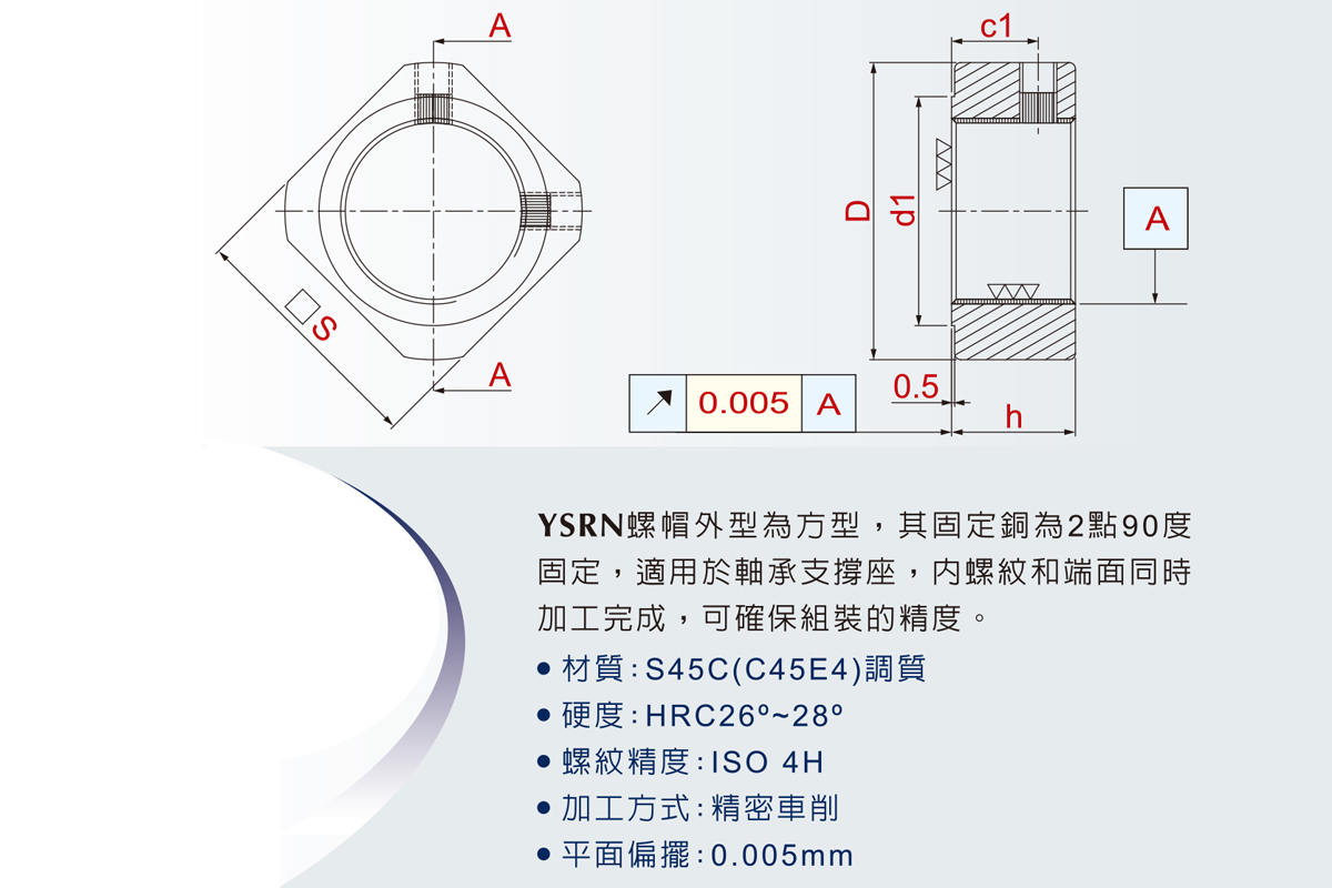 YSRN螺帽外型為方型,其固定銅為2點90度固定,適用于軸承支撐座,內(nèi)螺紋和端面同時加工完成,可確保組裝的精度。