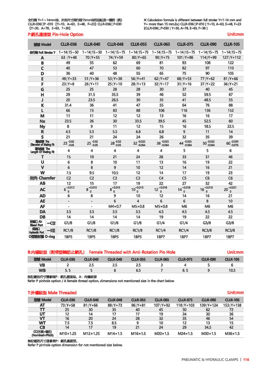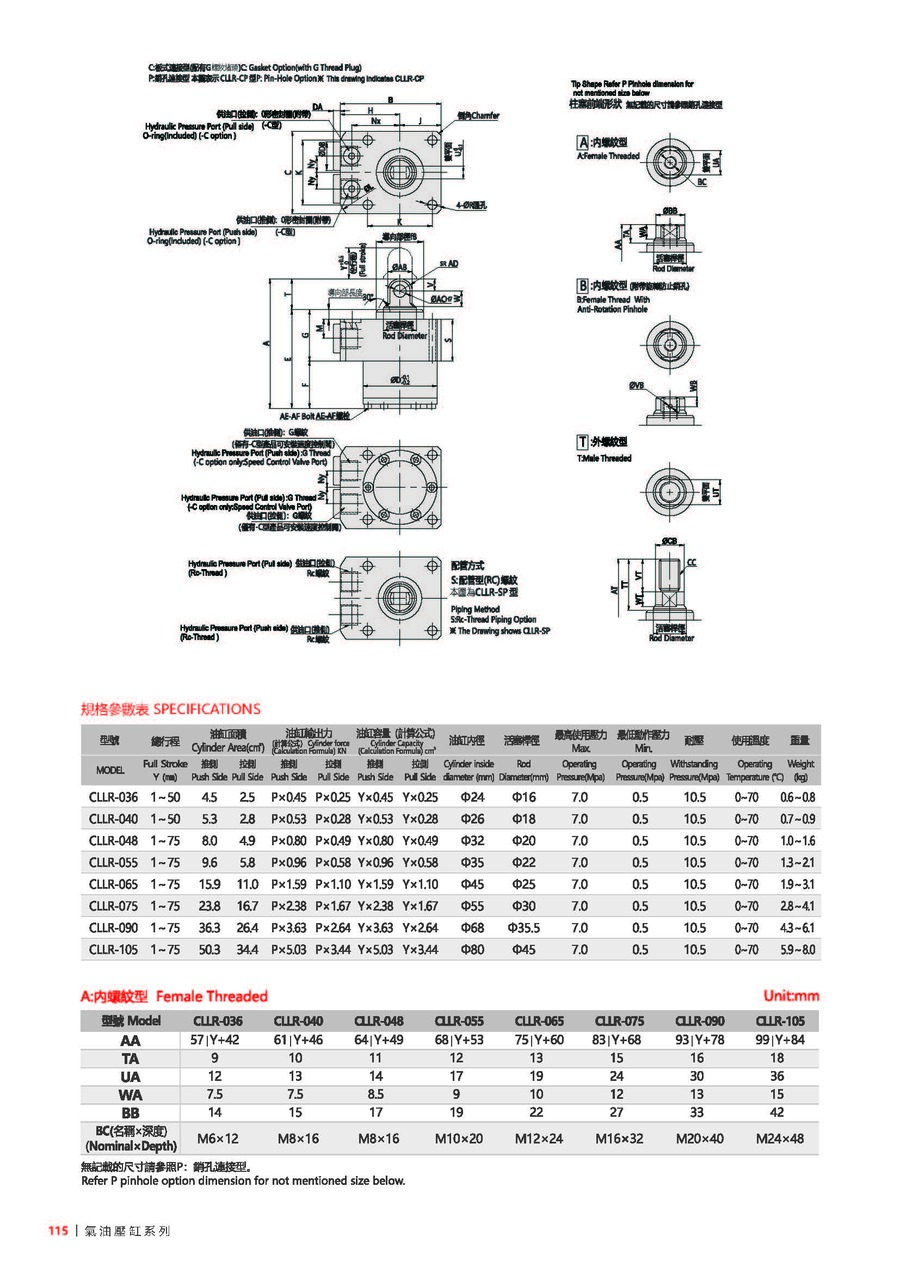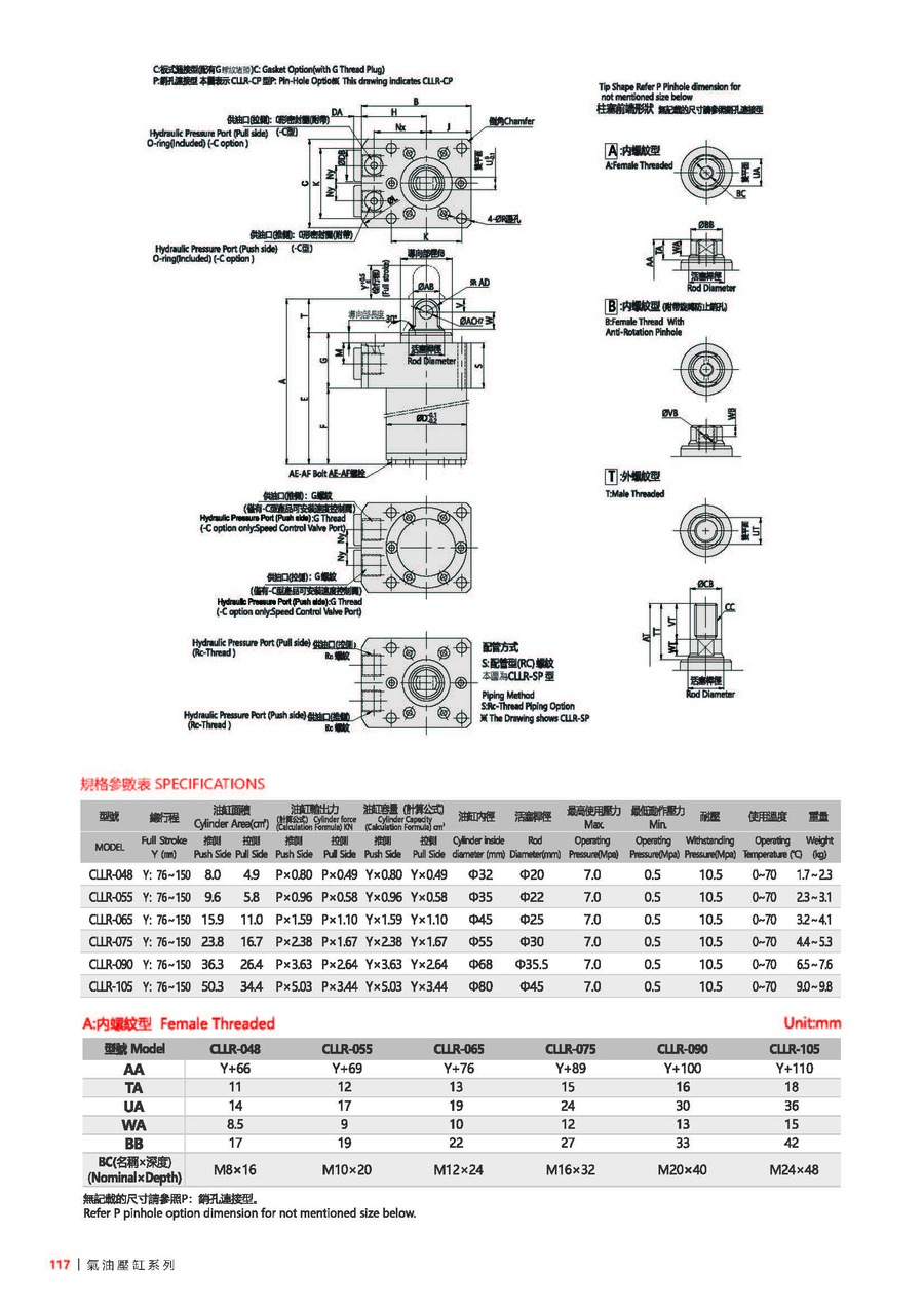 036: ?D=36, 040: ?D=40, 048: ?D=48, 055: ?D=55, 065: ?D=65, 075: ?D=75, 090: ?D=90, 105: ?D=105(注: ?D是油缸本體外徑尺寸)