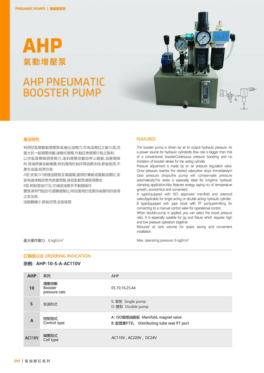 利用空氣壓驅動增壓泵浦,輸出油壓力,作為油壓缸之動力源,流量大于一般增壓倍數,連續式增壓,作動缸無增壓行程之限制。