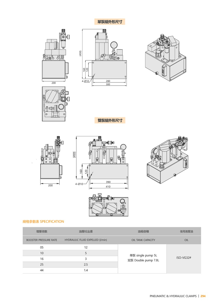 附配管座P.T孔,可連接油壓手手動閥操作,雙泵浦爭門組合可選購增壓比,特別適用于低壓與高壓同時使用之夾治具,油箱體積小,節省空間,安裝容易。